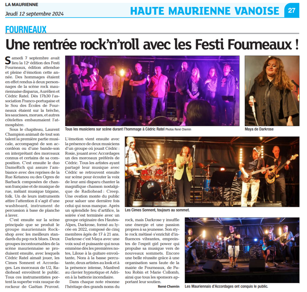 Sous le chapiteau, la soirée a débuté avec le talent de Laurent Champion, suivi de l’énergie folk et festive du duo DameRich et de leur étonnante « washboard ». La scène principale a ensuite pris le relais avec Rockshop et ses standards pop-rock blues, avant de laisser place aux groupes emblématiques de la vallée : Les Cimes Sonnent et Accordages. La jeunesse n’était pas en reste avec la performance incendiaire de Darkrose, venu des Hautes-Alpes, insufflant un vent de « girl power » et de soul.